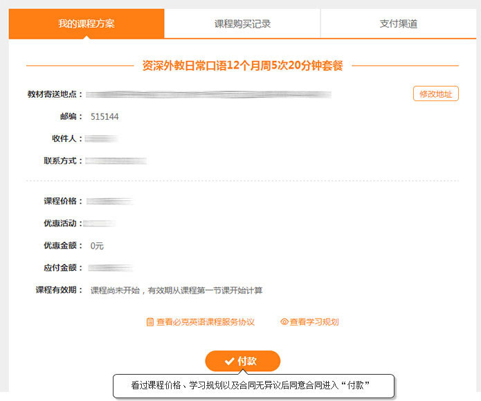 Step3:进入我的课室“购买课程”,即可查看“我的学习方案”。看过课程价格、学习规划以及合同无异议后同意合同进入“付款”;